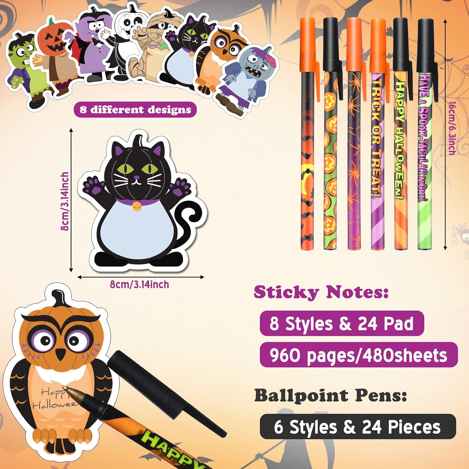 Package Contains: you will receive Halloween sticky notepads, 8 styles, each style has 3 pads, 20 sheets/ pad, total 480 sheets, and you will get 24 Halloween ballpoint pens in 8 styles, sufficient quantity and various styles, which ensures your daily use and replacement needs, and you can share these Halloween theme pens, notepads with your friends or classmates