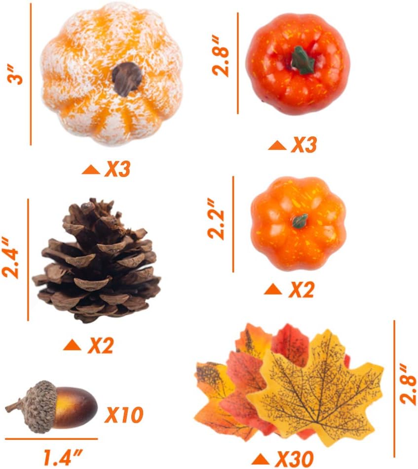 PREMIUM QUALITY- Our mini pumpkins, acorn and pine cone are hand made by professional artisans, lifelike and realistic, exquisite and colorfast, lightweight and durable, non-toxic and odorless. Fake maple leaves are made of premium silk, vivid and longlasting.
