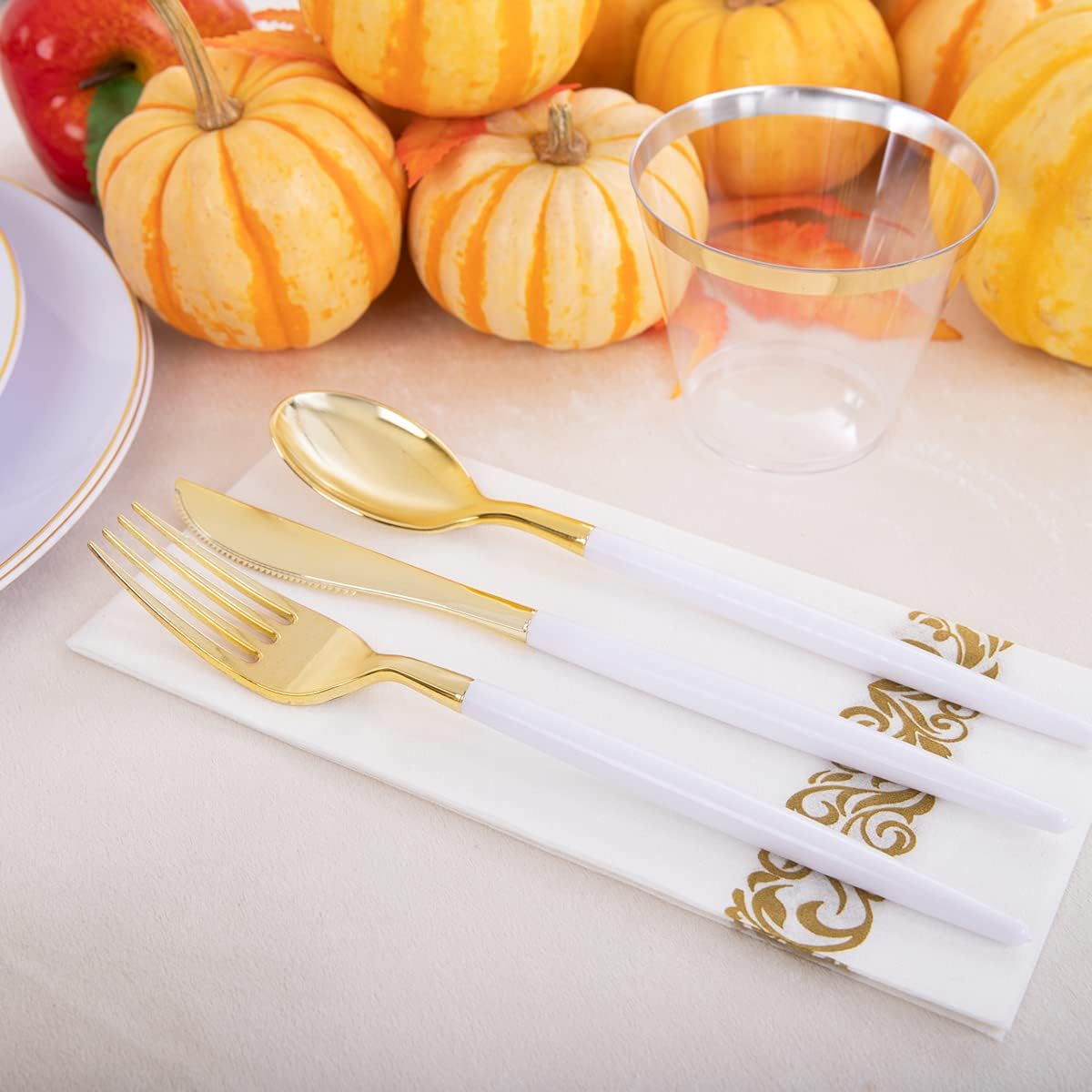 SUPER SUIT COMBINATION: Contains all gold Thanksgiving plates for 25 guests, a total of 25 dinner plates, 25 dessert plates, 25 knives, 25 forks, 25 spoons, 25 clear cups with gold rims, and 25 napkins. The value-for-money gold plastic silverware will create a charming Thanksgiving party for you.