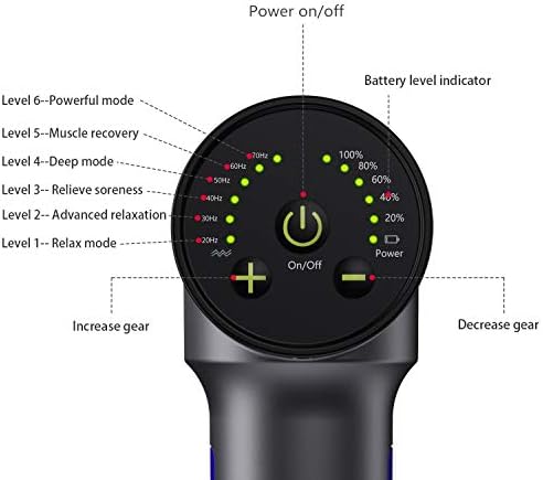 6 Speed levels: This massage gun deep tissue has a total of 6 speeds (1-2 wake muscles, 3 relieve soreness, 4 deep tissue massage, 5 muscle recovery, 6 suitable for use after high-intensity exercise).
